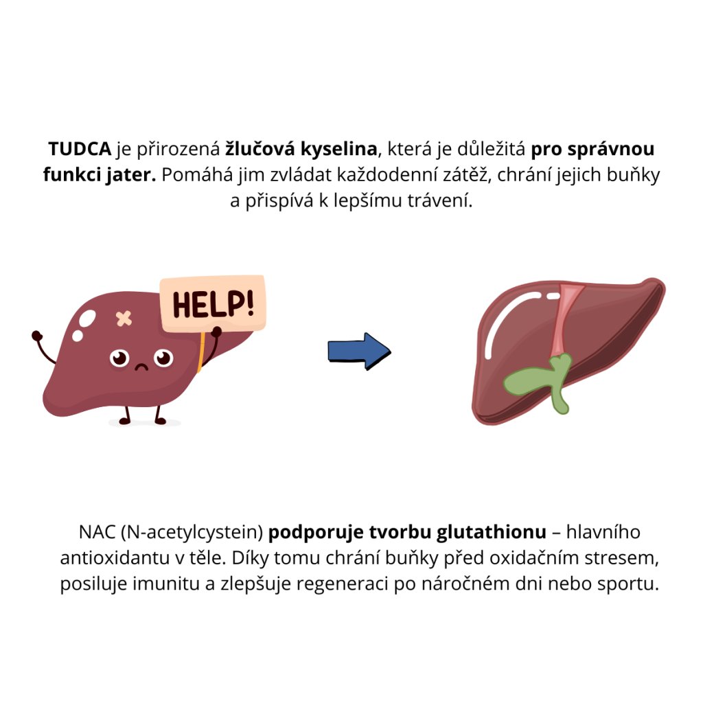 Kombinace TUDCA + NAC pomáhá játrům k obnově, chrání buňky před poškozením a podporuje jejich správnou funkci.